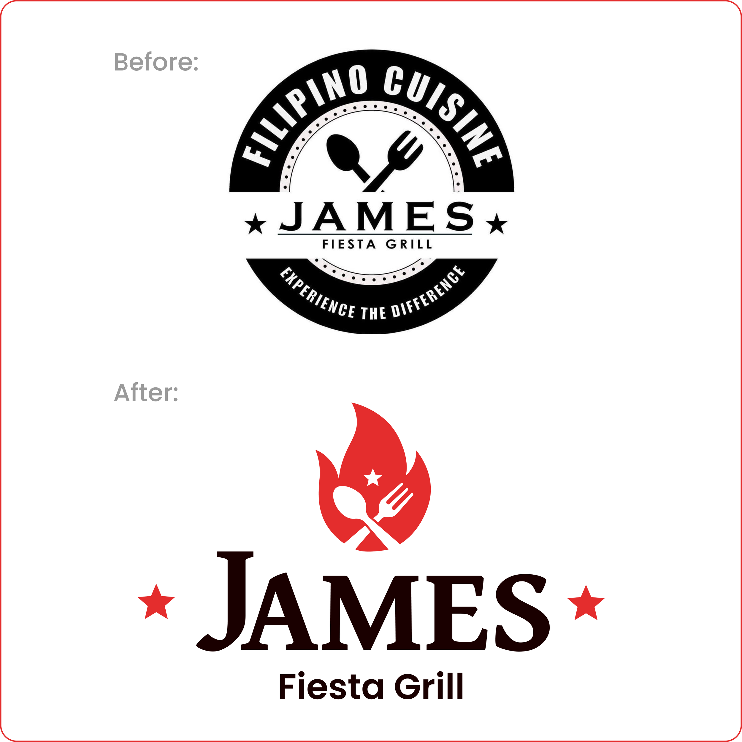 The original logo, while rich in design elements, appeared outdated and cluttered. I preserved the "James Fiesta Grill" structure but modernized the fonts, using Dai Banna SIL for "James" and Poppins for "Fiesta Grill." To honor Filipino culture, I retained the spoon and fork and included a third star above the utensils, referencing the Filipino flag. Lastly, I integrated a flame element to emphasize the "grill" theme, choosing a black and white color palette accented with red for contrast.