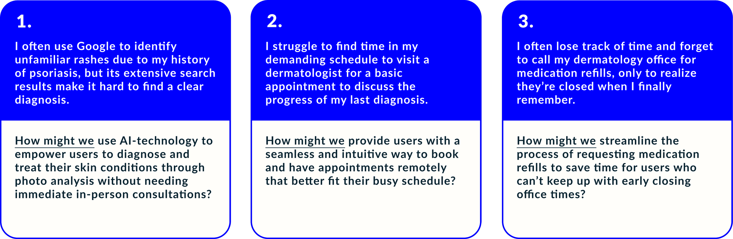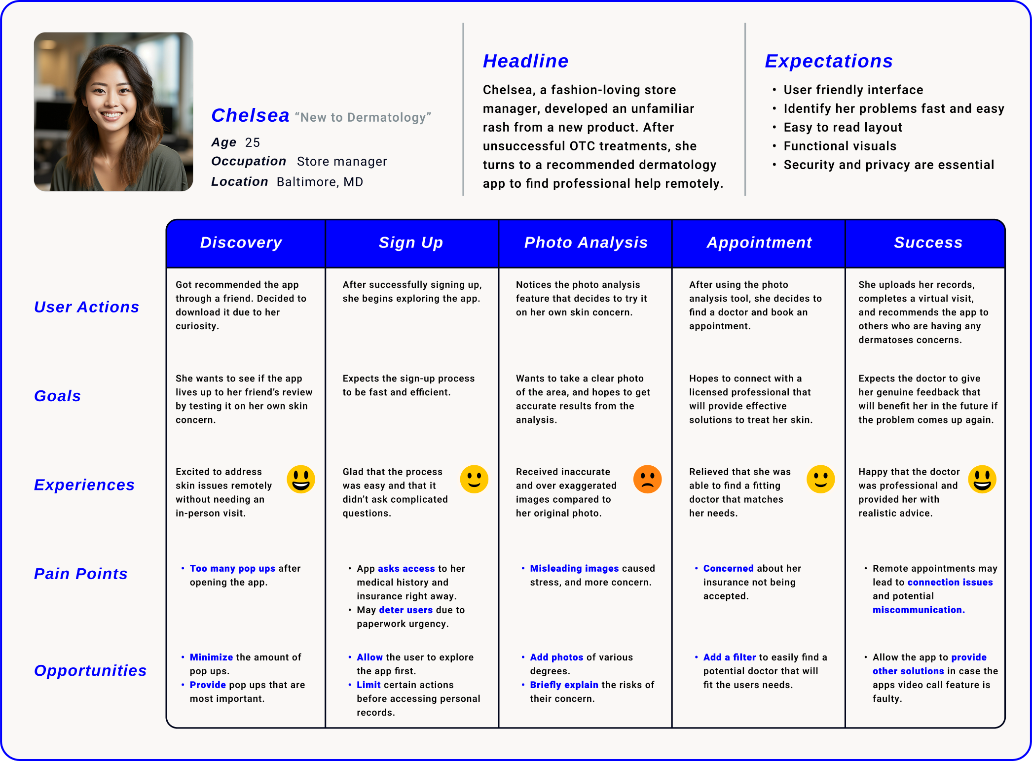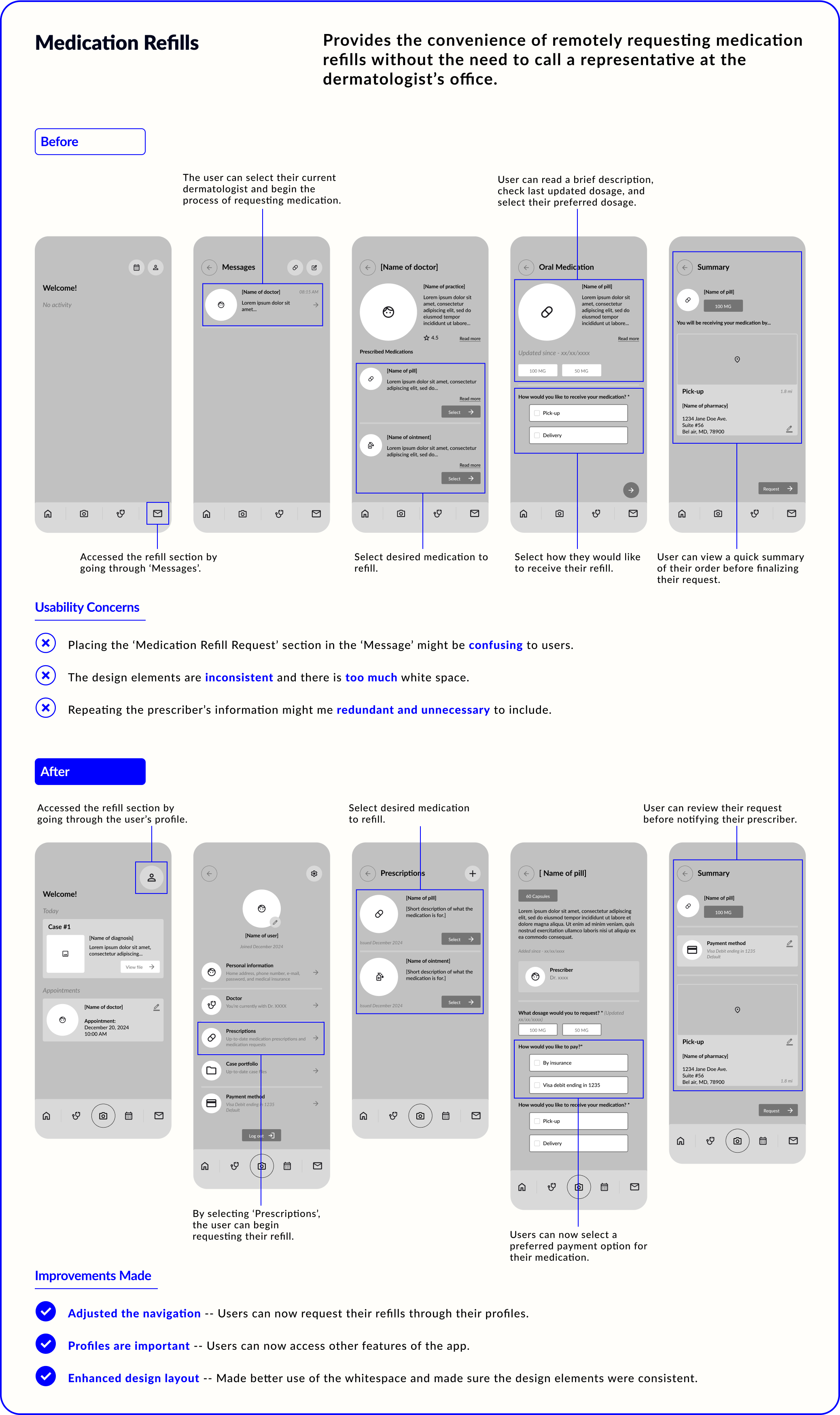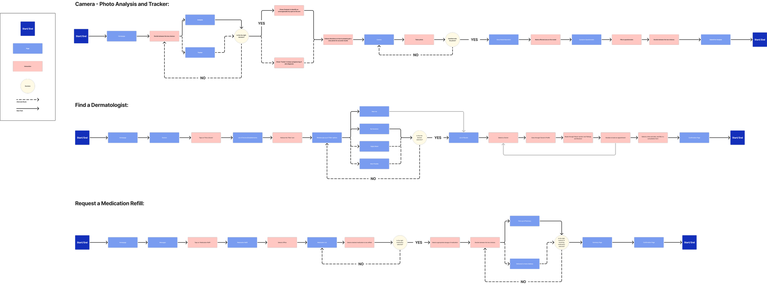 The main tasks developed included onboarding, photo analysis, locating a dermatologist, and requesting medication refills. I prioritized user needs to ensure the app would be beneficial for potential users.