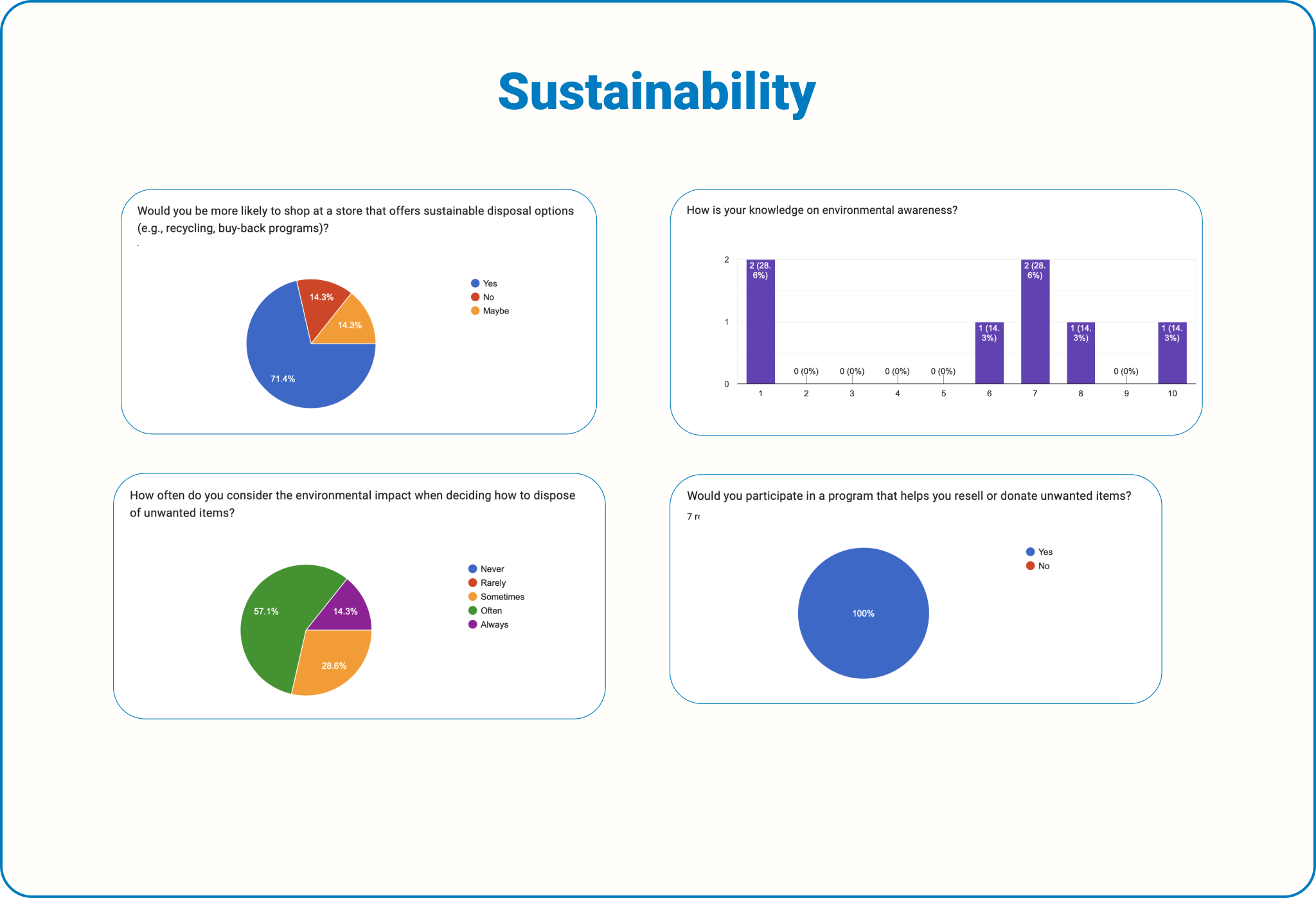 Developed a questionnaire to understand consumer habits, preferences, and experiences in shopping, returning, and sustainability practices. This includes 20 questions and 2 conclusions, taking 5-10 minutes to complete: