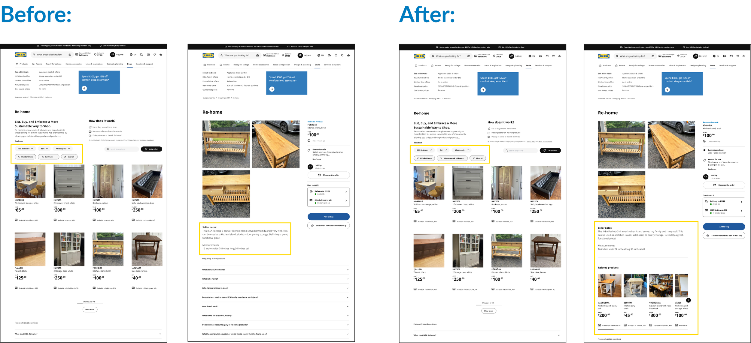 I added an additional card for the ‘Listing’ button to improve its visibility, as some users found it difficult to locate. They also commented that it was too small and easily overlooked. To align with IKEA’s branding, I extended the ‘Re-home’ section with a distinct card for the button, as well as cards outlining the benefits of choosing ‘Re-home’.